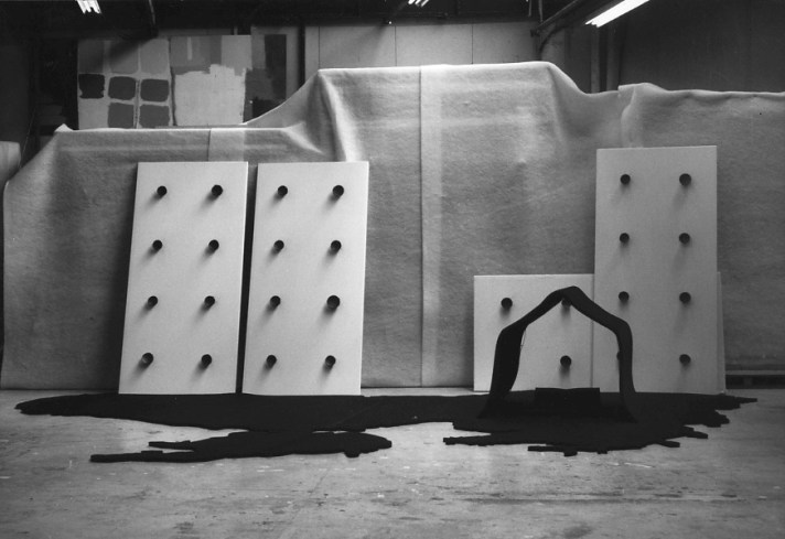 Installation pour l’exposition « Des territoires » (commissaire Jean-François Chevrier, 2001, Paris) qui réutilisait le matériau exotique de la noix de coco découverte à la Plaine Saint-Denis et d’une mousse industrielle noire. Ce décor pouvait être la métaphore d’un autre pays, territoire intérieur que s’inventeraient les exilés, déplacés réfugiés politiques et économiques constituant les nouvelles diasporas.